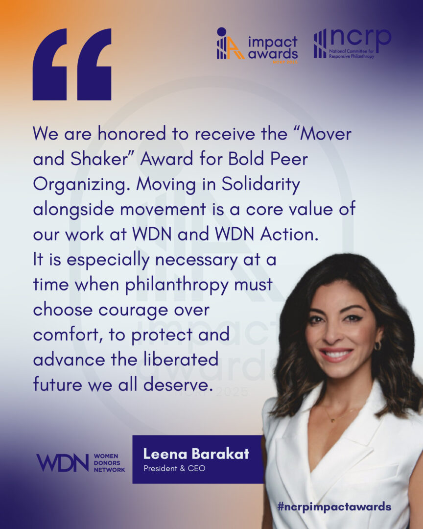 “Our Selection Committee chose Women Donors Network for their extraordinary work remaining steadfast in advancing justice, equity and systemic change through values-driven action,” said NCRP President and CEO Aaron Dorfman. At a time of heightened scrutiny and political pressure, WDN’s unwavering courage is a model for progressive donor organizers.”