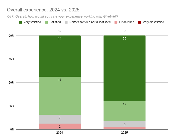 GiveWell’s second annual grant investigation survey was sent to organizations that participated in our grant investigation process from April 2024 through July 2025.1We sent the same survey in two segments, one in February 2025 and one in September 2025. jQuery(‘#footnote_plugin_tooltip_16393_1_1’).tooltip({ tip: ‘#footnote_plugin_tooltip_text_16393_1_1’, tipClass: ‘footnote_tooltip’, effect: ‘fade’, predelay: 0, fadeInSpeed: 200, delay: 400, fadeOutSpeed: 200, position: ‘top right’, relative: true, offset: [10, 10], }); We invited a total of 122 individuals representing 75 organizations to participate, and we received 80 responses (66% response rate). Included in the total were 22 contacts from investigations that did not result in a grant, from which we received five responses.
